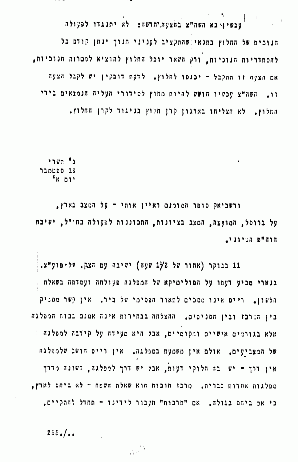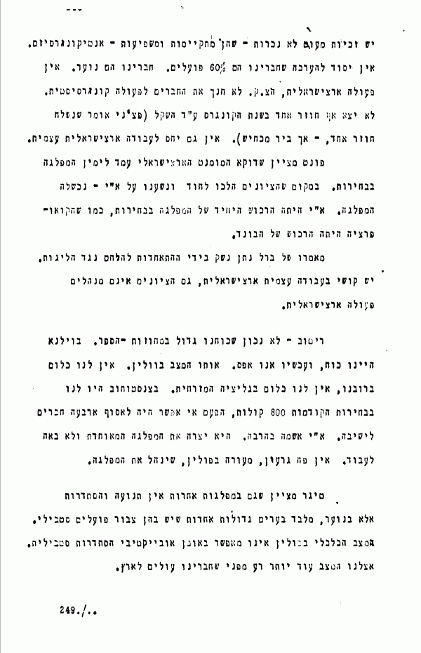 {P001} {0096-34} ראש השנה תרפ"ט א' תשרי 15 ספטמבר שבת בעשר ורבע (באחור של 3/4 שעה) ישיבה עם הצ.ק. של פע"צ. ברדיצבסקי - בשעה שהבונד ופוע"צ שמאל מצומצמים בשטח יותר קטן וכרכזים בערים גדולות - מפוורת מפלגתנו על שטח יותר רחב ובמספר עירות יותר גדול, וקשה לשלוט מבחינה סידורית בסניפינו. עודנו במדה רבה מפלגה של נוער, אך אין לנו במה להעסיק את החבר מגיל יותר זקן הזקוק לענין מקומי אין מוסדות, אין בתי ספר, אין כוח בעיריה ובקהלה. הבונד מושך את "דלות העם" - בעלי המלאכה הזעירים ויסד אגודה סוציאליסטית של בעלי מלאכה. במשבר האר"י אין אנו יכלים למשוך את החוגים האלה, היות שאינם יכלים לעלות לארץ. {0096-35} אין בגושי החברים מסירות למפלגה ומשמעת, כי אין מוסד שיקשר אותו, יותר טוב קצת המצב בערים (בריסק, פינסק, שיש למפלגה בהן ב"ס. בעלי ענין מקומי מסויים אי אפשר להגדיל אחריות החברים. אין המפלגה יכלה לתפוס מקום הגון בפעולת בתי הספר. צישאו בידי הבונד, ואי אפשר לחדור שמה, גם לתרבות אי אפשר לחדור - מפני ששם שלטת הספירה הבורגנית, אם נכנס לתרבות - ילחמו בעלי הבתים נגדנו. בסלונים לא הסכימו חברינו לקבלת פנים של רייס, כי באספה היו השה"צ צריכים לשיר עברית. בועידה היה גלוי של שנאה לעברית. שפיזמן אינו מסכים להערכת ברדיצבסקי ביחס לב"ס. הוא מופר שהחברים בגליל וילנא טוענים תנו לנו מורים ונמסור בידיכם המון בתי ספר של י.ש.א. גם ההבראיסטים אינם פועלים. לדעת שפיזמן התנהגה הפרקציה של המפלגה בועידת א"י העובדת, מלבד יחידים, כהוגן. הוא מאשים את הדלגציה שלא עכבו את ההזמנה של התרבות ושל צ.ק. הציונים הבורגנים. ביר קובל על ההרצאות האופטימיסטיות של החברים הקודמים. אין כמעט אף סניף אקטיבי אחד. המפלגה אינה קיימת, אלא כשמגיע ענין בחירות. "ההצלחות" בבחירות הן מדומות. בבריסק נסוגונו אחור. אין לנו שום השפעה בתנועה המקצועית, בימי העליה היתה לנו השפעה במזריץ, בפינסק כשהכנסנו חלוצים לאגודות המקצועיות. יש זכיות מועט נכרות - שאינן מתקימות למעשה - זכות המעוט העברי. אולם {0096-36} יש זכיות מעוט לא נכרות - שהן.מתקיימות ומשפיעות - אנטיקונגרסיזם. אין יסוד להערכה שחברינו הם 60% פועלים. חברינו הם נוער. אין פעולה ארצישראלית,הצ.ק. לא חנך את החברים לפעולה קונגרסיסטית. לא יצא אף חוזר אחד בשנת הקונגרס ע"ד השקל (פצ'ני אומר שנשלח חוזר אחד, - אך ביר מכחיש). אין גם יחס לעבודה ארצישראלית עצמית. פונט מציין שדוקא המומנט הארצישראלי עמד לימין המפלגה בבחירות. במקום שהציונים הלכו לחוד ונשענו על א"י - נכשלה המפלגה. א"י היתה הרכוש היחיד של המפלגה בבחירות, כמו שהקואו- פרציה היתה הרכוש של הבונד. מאמרו של ברל נתן נשק בידי ההתאחדות להלחם נגד הליגות. יש קושי בעבודה עצמית ארצישראלית, גם הציונים אינם מנהלים פעולה ארצישראלית. ריטוב - לא נכון שכוחנו גדול במחוזות =הספר. בוילנא היינו כוח, ועכשיו אנו אפס. אותו המצב בוולין. אין לנו כלום ברובנו, אין לנו כלום בגליציה המזרחית. בצנסטוחוב היו לנו בבחירות הקודמות 800 קולות, הפעם אי אפשר היה לאסוף ארבעה חברים לישיבה. א"י אשמה בהרבה. היא יצרה את המפלגה המאוחדת ולא באה לעבוד. אין פה גרעון, מעורה בפולין, שינהל את המפלגה. טיגר מציין שגם במפלגות אחרות אין תנועה והסתדרות אלא בנוער, מלבד בערים גדולות אחדות שיש בהן צבור פועלים סטבילי. המצב הכלכלי בפולין אינו מאפשר באופן אובייקטיבי הסתדרות סטבילית. אצלנו המצב עוד יותר רע מפני שחברינו עולים לארץ. {0096-37} באנטיקונגרסיסם אשמים החברים שאינם מבארים לחברים את המלחמה שיש בקונגרס ובוה"פ. 1/2 4 ישיבה עם ההנהגה העליונה של השה"צ. פרומנסקי מרצה על המצב בהשה"צ 200-180 קנים בפולין (לרבות וילנא, בלי גליציה) 11.000 חברים, החל מגיל 12 ומעלה. חנוך חלוצי קבוצי כפירים עד 13, צופים עד 17, למעלה קשישים. האחרונים בערך 3.000. יש תסיסה בשאלות חנוכיות. הסתדרות השה"צ חדלה לטפל רק בפעולה פנימית. עוסקים בקה"ק, בתרבות (תמיכה בב"ס והוראה בתוכם), עבודת הקפא"י; בתעמולה לבחירות בקהלות חברי השה"