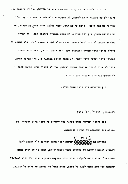 {0200-101} 13.4.65, יום ג' יא' ניסן בבוקר הגיעו תחילה שרגא ובש - שאחזור לפעולה המפלגתית. מיד אחריהם באו למדרשה כחמשים חברי ועד הסניף בת"א. אלפרט, זילברמן, יעל וויינר ועוד. דורשים שובי לעמוד בראש המפלגה ובראש הרשימה בכנסת ובהסתדרות. אמרתי להם שאני מצטער שבאו הנה. שני אוטובוסים עולים 600 לי - היה יותר קל ויותר זול שאני אבוא לת"א. {0200-102} אני מוכן להפגש עם כל קבוצת חברים - רוב או מיעוט, אבל לא קיבלתי שום מינוי למוסד מפלגתי - לא ללשכה, לא ומזכירות ולא למרכז. מפלגת פועדי א"י שהייתי בה מאז קומה - אינה קיימת עוד. זוהי מפלגה אחרת שאין בה חברות, אין בה וויכוח חפשי, אין דעת הברים, יש צמרת בממשלה שקובעת הכל. זה התחיל משליחת התכתב לחולדה לבטל החלטת המרכז מבלי להביא השאלה למרכז אלא במקום זה שידלו באופן פרטי חברים וקבוצות ועשו זאת יומם ולילה, ומאז הורע המצב. המדרון הולך ונעשה תלול יותר. לא אוכל להיות במפלגה זו. אין מפלגה אחרת, ועוד לא אבדה לגמרי תקוותי שהמצב ישתנה, אבל לא אעמוד בראש רשימת ההסת' - לא אשתתף בבחירות ואסביר לצבור מדוע. בין הדוברים היו דובב אנשי הרוב.