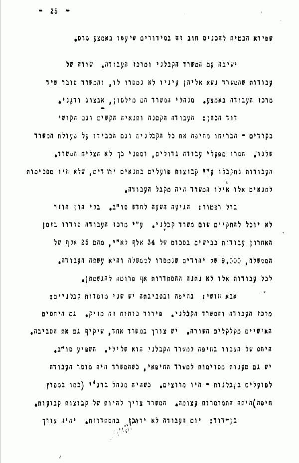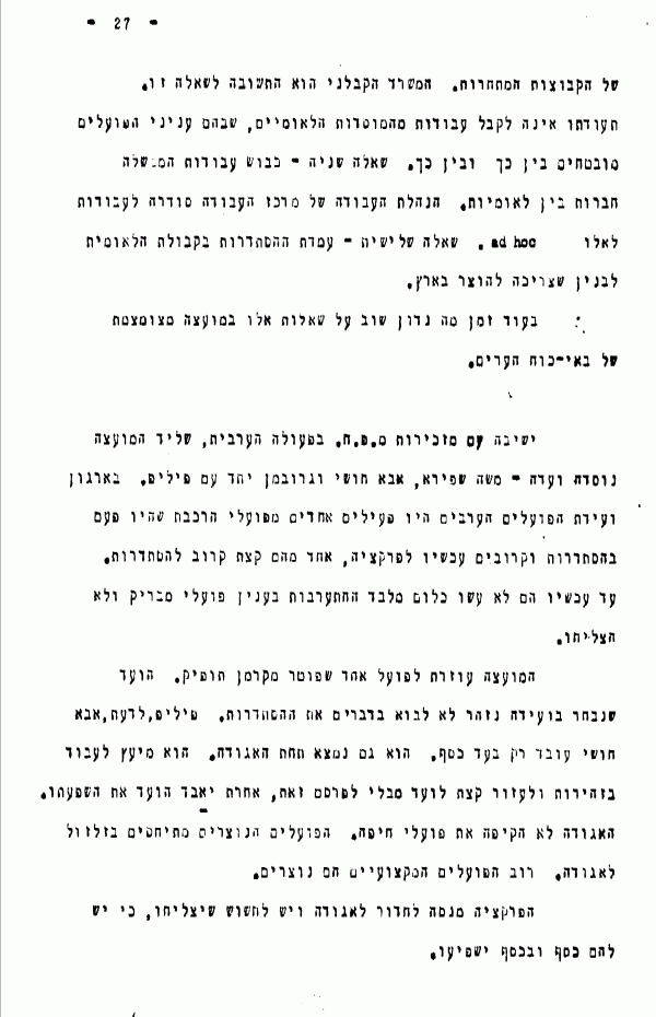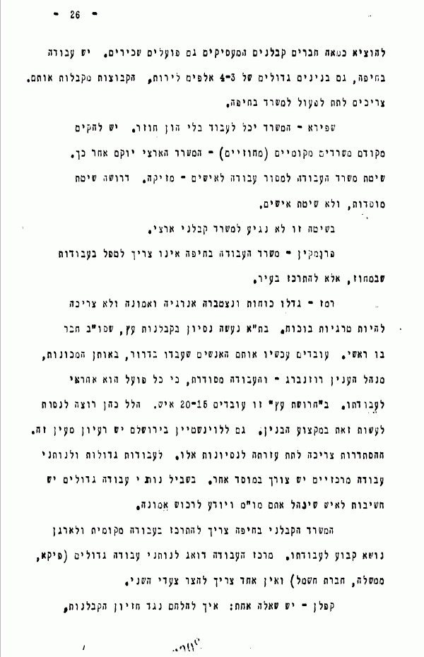 {P001} {0098-24} ז' שבט 5 פברואר יום ג' נסענו בבוקר לחיפה. ישיבת מזכירות הוה"פ עם מ.פ.ח. שיביץ תובע 400 לא"י ממפ"ח לדבר ודורש תשלומין מסודרים כפי ההסכם 75 לא"י לשנה. {0098-25} שפירא הבטיח להכניס חוב זה בסידורים שיעשו באמצע מרס. ישיבה עם המשרד הקבלני ומרכז העבודה. שורה של עבודות שהמשרד נשא אליהן עיניו לא נמסרו לו, והמשרד סובר שיד מרכז העבודה באמצע. מנהלי המשרד הם מילסון, אבצוג ודגני. דוד הכהן: העבודה הקטנה ותנאיה הקשים וגם הקושי בקרדיט - הבריחו מחיפה את כל הקבלנים וגם הכבידו על פעולת המשרד שלנו. חסרו מפעלי עבודה גדולים, ומפני כך לא הצליח המשרד. העבודות נתקבלו ע"י קבוצות פועלים בתנאים ירודים, שלא היו מסכימות לתנאים אלו אילו המשרד היה מקבל העבודה. ברל רפטור: הגיעה השעה לחדש סו"ב. בלי הון חוזר לא יוכל להתקיים שום משרד קבלני. ע"י מרכז העבודה סודרו בזמן האחרון עבודות כבישים בסכום של 34 אלף לא"י, מהם 25 אלף של הממשלה, 9.000 של יהודים שנמסרו לממשלה והיא עשתה העבודה. לכל עבודות אלו לא נתנה ההסתדרות אף פרוטה להגשמתן. אבא חושי: בחיפה ובסביבתה יש שני מוסדות קבלניים: מרכז העבודה והמשרד הקבלני. פירוד כוחות זה מזיק. גם היחסים האישיים מקלקלים השורה. יש צורך במשרד אחד, שיקיף גם את הסביבה. היחס של הצבור בחיפה למשרד הקבלני הוא שלילי. השפיע סו"ב. יש גם טענות מסוימות למשרד החיפאי, כשהמשרד היה מוסר העבודה לפועלים בקבלנות - היו מרוצים. כשהיה מנהל ברג'י (כמו במפרץ חיפה)היתה התמרמרות עצומה. המשרד צריך להיות של קבוצות קבועות. בן-דוד: יום העבודה לא ירוכז בהסתדרות. יהיה צורך {0098-26} להוציא כמאה חברים קבלנים המעסיקים גם פועלים שכירים. יש עבודה בחיפה, גם בנינים גדולים של 4-3 אלפים לירות, הקבוצות מקבלות אותם. צריכים לתת לפעול למשרד בחיפה. שפירא - המשרד יכל לעבוד בלי הון חוזר. יש להקים מקודם משרדים מקומיים (מחוזיים) - המשרד הארצי יוקם אחר כך. שיטת משרד העבודה למסור עבודה לאישים - מזיקה. דרושה שיטת מוסדות, ולא שיטת אישים. בשיטה זו לא נגיע למשרד קבלני ארצי. פרומקין - משרד העבודה בחיפה אינו צריך לטפל בעבודות שבמחוז, אלא להתרכז בעיר. רמז - גדלו כוחות ונצטברה אנרגיה ואמונה ולא צריכה להיות טרגיות בוכוח. בת"א נעשה נסיון בקבלנות עץ, שסו"ב חבר בו ראשי. עובדים עכשיו אותם האנשים שעבדו בדרור, באותן המכונות, מנהל הענין רוזנברג - והעבודה מסודרת, כי כל פועל הוא אחראי לעבודתו. ב"חרושת עץ" זו עובדים 20-15 איש. הלל כהן רוצה לנסות לעשות זאת במקצוע הבנין. גם ללוינשטיין בירושלם יש רעיון מעין זה. ההסתדרות צריכה לתת עזרתה לנסיונות אלו. לעבודות גדולות ולנותני עבודה מרכזיים יש צורך במוסד אחר. בשביל נותני עבודה גדולים יש חשיבות לאיש שינהל אתם מו"מ ויודע לרכוש אמונה. המשרד הקבלני בחיפה צריך להתרכז בעבודה מקומית ולארגן נושא קבוע לעבודתו. מרכז העבודה דואג לנותני עבודה גדולים (פיקא, ממשלה, חברת חשמל) ואין אחד צריך להצר צעדי השני. קפלן - יש שאלה אחת: איך להלחם נגד חזיון הקבלנות, {0098-27} של הקבוצות המתחרות. המשרד הקבלני הוא התשובה לשאלה זו. תעודתו אינה לקבל עבודות מהמוסדות הלאומיים, שבהם עניני הפועלים מובטחים בין כך ובין כך. שאלה שניה - כבוש עבודות הממשלה חברות בין לאומיות. הנהלת העבודה של מרכז העבודה סודרה לעבודות לאלו adhoc . שאלה שלישית - עמדת ההסתדרות בקבולת הלאומית לבנין שצריכה להוצר בארץ. בעוד זמן מה נדון שוב על שאלות אלו במועצה מצומצמת של באי-כוח הערים. ישיבה עם מזכירות מ.פ.ח. בפעולה הערבית, שליד המועצה נוסדה ועדה - משה שפירא. אבא חושי וגרובמן יתד עם פיליפ. בארגון ועידת הפועלים הערבים היו פעילים אחדים מפועלי הרכבת שהיו פעם בהסתדרות וקרובים עכשיו לפרקציה, אחד מהם קצת קרוב להסתדרות. עד עכשיו הם לא עשו כלום מלבד ההתערבות בענין פועלי מבריק ולא הצליחו. המועצה עוזרת לפועל אחד שפוטר מקרמן תופיק. הועד שנבחר בועידה נזהר לא לבוא בדברים אם ההסתדרות. פיליפ,לדעת,אבא חושי עובד רק בעד כסף. הוא גם נמצא
