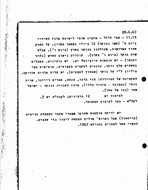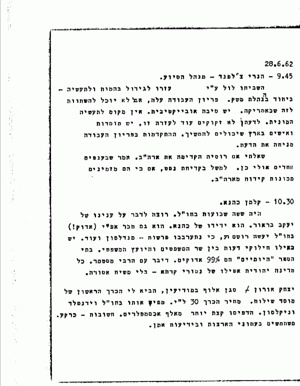 {P001} {0195-31} 28.6.62 9.45 - הנרי צ'לפנד - מנהל הסיוע. השביחו לול ע"י עזרו לגידול בהמות ולתעשיה - ביחוד בהנהלת משק. פריון העבודה עלה, אבללא יוכל להשתוות לזה שבאמריקה. יש סיבה אובייקטיבית. אין מקום לתעשיה המונית. לדעתן לא זקוקים עוד לעזרה זו, יש מוסדות ואישים בארץ שיכולים להמשיך. ההתקדמות בפריון העבודה מניחה את הדעת. שאלתי אם רוסיה הקדימה אח ארה"ב. אמר שבענפים אחדים אולי כן. למשל בקדיחת נפט, אם כי הם מזמינים םכונות קידוח מארה"ב. 10.30 - קלמן כהנא. היה ששה שבועות בחו"ל. רוצה לדבר על ענינו של יעקב בראור. הוא ידידו של כהנא. הוא גם חבר אפ"י (אדוק,) בחו"ל יעשה רושם רע, כי נתערבבו פרשות - מנדלסון ועוד. יש כאילו חילוקי דעות בין שר המשפטים והיועץ המשפטי. בתי הספר "היומיים" הם 99% אדוקים. דיבר עם הרבי מסטמר. כל מדינה יהודית אפילו של נטורי קרתא - בלי משיח אסורה. יצחק אורון - סגן אלוף במודיעין, הביא לי הכרך הראשון של מוסד שילוח. מחיר הכרך 30 ל"י. מפיץ אותו בחו"ל וידנפלד וניקלסון. הדפיסו קצת יותר מאלף אכסמפלרים. חשובות - כרקע. משתמשים בעתוני הארצות ובידיעות אמן. {0195-32} 11.15 - צבי ברנר - מזמין אותי לישיבת מרכז האיחוד ביום ה' (עשר בבוקר) 12 ביולי במשמר השרון. על הפרק אחוד המדרשות, עבודתנו בנוער בארץ (ביום ו'), קבלת שדה בוקר (ביום ו' בערב). עובדים בישוב החדש (בעיר ובכפר) - יש תוצאות חיוביות? יש. יש גרעינים. מטפלים בתשעים אלף נוער. נכנסים לסקציה מקצועית. מוציאים חצי מיליון ל"י על נוער (שמחוץ למשקים). יש עליה מדרום אפריקה. האקטיבה של המזירות: צבי ברנר, הנטה, אפרים רייזנר, אריה בנאי (ממצובה - מזכיר כללי). מרכז העבודה בנוער - ישראל שפר (בנו של שפר). לאיחוד יש 12 גרעינים; לקבה"מ יש .3 לקה"א - כמו לקיבוץ המאוחד. יש ידיעה מוסמכת שחוקר מצרי שעבד במעבדה בריטית (בריסטול) אצל הפרופ' ארליס התמחה ליצור גזי עצבים. המצרי חזר למצרים בתחילת .1962
