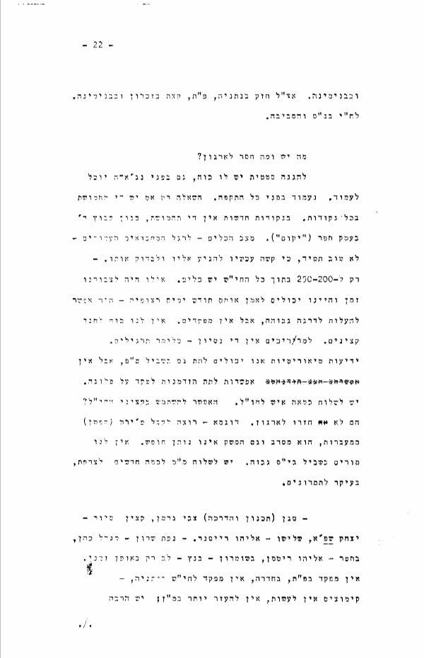 {P001} {0037-19} 7.4 .47 [ נתונים מספריים, ראה מקור מודפס ] משה - משער העמקים עד מתולה (מערב העמק נהלל עד מעברות) שייך לחיפה. יש בו 120 נקודות: 4 נפות: 1) יזרעאל, 2) גלבוע, 23, 3) כנרת, 31, 4) תל-חי, 30. בנפה 1 יש 12.000 נפש, ב2- - 7.500, ב3- - 13.700, ב4- - .7500 ב1- יש 763 חי"ש, 2788 חי"מ; 64 נוטרים, 781 גדנ"ע - ס"ה 4.306 בגלבוע - 273 חי"ש, 2.692 חי"מ, 22 נוטרים ומכי"ם 448 גדנ''ע " 3.435 בכנרת - 425 חי"ש, 2.097 חי"מ, 49 " 585 גדנ"ע. " 3.156 בתל-חי - 310 חי"ש, 1515 חי"מ, 59 נוטרים, 241 גדנ" ע " 2.116 ס"ה חי"ש - 1771, חי"מ 9092, נוטרים 19), גדנ"ע 2055- " 13.112 *) יש עוד נוטרות במשקים 1-4 בכל משק. בטבריה - 60 חי"ש, 100 חי"מ, 110 גדנ"ע (יש עוד 50 שאינם מאורגנים). אימנו מאחרי 29 ביוני כ500- איש בני 22-18 מהחי"ש - מהצעירים ביותר, באופן מרוכז במשך שבעים לשם פעולה (מחלקת דבורים), מאז 3 ימים רצופים אחת לחודש (מסעות וסיורים) - לפני כך קיבלו אמון של גדנ"ע והיו שנה בחי"ש (אמון של שגה יום והצי לחודש (עשר שעות ביום אימון). {0037-20} בכל הגליל יש 10 פלוגות (2 בת"ח, 2 בגלבוע, 2 בכנרת, 4 ביזרעאל) - 150 בכל פלוגה. אין אמונים ותמרונים של פלוגות, אלא מחלקה בלבד - מחוסר אפשרות ליגלית וגם מחוסר החשבה. האמון לקצינים ניתן רק בדרנה של מ"מ - קורס זה נמשך 3 תדשים, ונותן למ"כ (שעבר קורס של חדשיים). הקצינים שחזרו מהצבא משתתפים בקורסים ונותנים דברים חשובים מנסיונם. בני האכרים בגליל? רובם הלכו לנתניה. הנוער שנשאר הולך לארגון. בגליל התחתון אין אצ"ל. למשמר-הירדן נכנס "ארגון ווג'וואד" - ארגון רוויזיוניסטי - 40 משפחה. יש ביניהם גם חברי ההסת' וגם חברי אצ"ל מובהקים. לראש פנה הובאה פלוגת בית"ר (20 איש) לפני 3 חדשים. הנוער בראש-פנה נמצא בגדנ"ע - 20 בגיל גדנ"ע. במתולה כמעט שאין נוער. בטבריה המנהל יהודה בונק (בעל מסעדה קואופרטיבית, היה מקודם סרג'נט בנוטרים). יש 14 חברי אצ"ל ו3- לח"י (רובם אשכנזים.) חברי אצ"ל בני עשרים ומטה. בן אחד בן 24 (עובד במלון ציון, אשר בלוגסין ). בגדנ"ע בטבריה 120, ומשקיעים בהם כוחות. יש סניף של מכבי, 6 מחבריו הם באצ"ל. סגנו של משה מ. - מיכאל מיכאלי (יוצא ת"א), לא מסוגל להיות מגל, קצין תיכנון והדרכה; שליש - אליעזר לרמן(גם הוא מת"א) נמצא שם 3 חדשים, בחור טוב; יש קצין סיור - צבי סיני (בודד); קצין נוער - זאב (מוצאו מטירת-צבי). {0037-21} בנפה יש 2 אנשים מכף ומדריך נפתי. רק אלה מקבלים משכורת שלמה, הנוטרות ממלאה תפקיד חשוב בבטחון ובכושר הפעולה של הארגון. משכורת נוטר רווק 16,6, נשוי - 18; הודות להם עובדים כ14- איש במנגנון הנפה. מפקדי הפלוגות הם נוטרים, קצין שי, נשק, מפקד גדנע ועוד, הם נוטרים, ומקבלים מאתנו תוספת קטנה - מהממשלה רם מקבלים כעשרת אלפים לא"י לחודש, הנוטרים נותנים לנו: 1) עזרה תקציבית, 2) נשק, 3) מסגרת ליגלית. לנוטרים הולכים אנשי שנת- שרות, ויש לדעת משה להרחיב חובת הנוטרות משנה לשנתים. ותיקי הנוטרים (משנת 1932) עובדים לאט לאט. שנת השרות לא נותנת חומר אנושי םספיק. יש להעלות ערך הנוטרות בצבורנו. ----- - לב, מפרדס כץ לרבות פ"ת בדרום עד זכיון ועד בכלל. שלוש נפות: 1) שרון - אשר; 2) עמק-חפר - גד; 3) שומרון - נפתלי. 90 ישובים (63 אזורים), 6000 חי"מ, 1.200 חי"ש (3 פלוגות בשרון: 1 בפ"ת, 2 בשרון), בעסק- חפר - 1, בשומרון - 2. במ"ג 12 קבוצות (בכל קבוצה 18-20), נוטרים מקומיים כמאתים. בגדנ"ע 1500 חבר, (4 גדודים) 2 בשרון, 1 בעמק-חפר, 1 בשרון - רק 40% של חי"ש מוכשר לפעולה, כי כמה גרעינים עברו להתישבות (בנגב, בגליל ועוד) ובאו חדשים. גם 40% לא קיבלו עדיין האמון של החטיבה, הם מקבלים אמון 18 שעות בחודש, יש חוסר במפקדים (לפני הכנסו לתיכון עסק לב בבטחון של ההתישבות החדשה (קדם לו משה זליצקי שהעבר לחיפה). בזכרון הארגון לא חזק. הפורשים פועלים שם {0037-22} ובבנימינה. אצ"ל חזק בנתניה, פ"ת, קצת בזכרון ובבנימינה. לח"י בנ"ס והסביבה. מה יש ומה חסר לארגון? להגנה סטטית יש לו כוח, גם בפני נג'אדה יוכל לעמוד. נעמוד בפני כל התקפה. השאלה רק אם יש די תחמושת בכל נקודות. בנקודות חדשות אין די תחמושת, כגון קבוץ ד' בעמק חפר ("יקום"). מצב הכלים - לרגל המחבואים העמודים - לא טוב תמיד, כי קשה עכשיו להגיע אליו ולבדוק אותו. - רק ל250-200- בתוך כ