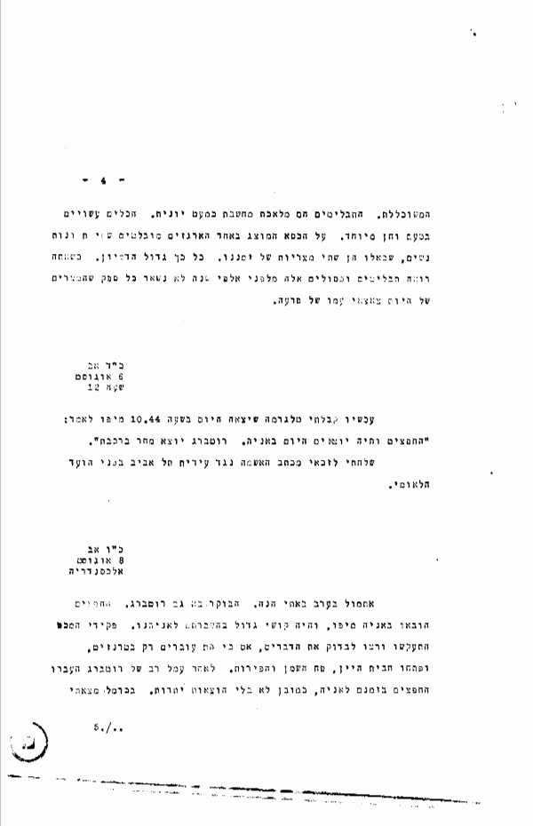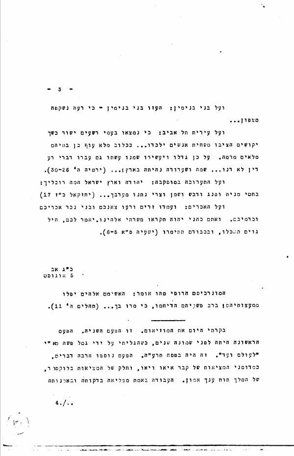 {P001} {0001-03} כ"ג אב 5 אוגוסט המונרכיסט הרוסי מהו אומר: האשימם אלהים יפלו ממעצותיהם! ברב פשעיהם הריחמו, כי מרו בך... (תהלים ה' 11). --------- בקרתי היום את המוזיאום. זו הפעם השניה. הפעם הראשונה היתה לפני שמונה שנים, כשהגליתי על ידי גמל פשה מא"י "לעולם ועד". זה היה בפסח תרע"ה. הפעם נוספו הרבה דברים, כמדומני המציאות של קבר איאו ויאו, וחלק של המציאות בלוקסור, של המלך תות ענך אמון. העבודה באמת מפליאה בדקותה ובאמנותה {0001-04} המשוכללת. התבליטים הם מלאכת מחשבת כמעט יונית. הכלים עשויים בטעם וחן מיוחד. על הכסא המוצג באחד הארגזים מובלטים שתי תמונות נשים, שכאלו הן שתי מצריות של זמננו. כל כך גדול הדמיון. כשאתה רואה תבליטים ופסולים אלה מלפני אלפי שנה לא נשאר כל ספק שהמצרים של היום צאצאי עמו של פרעה.